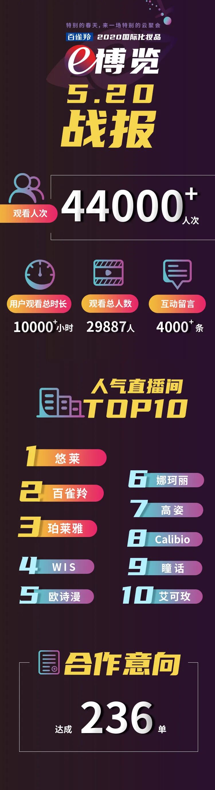 5月20日,由《化妆品报》主办、百雀羚品牌独家总冠名、中国百货商业协会、广东省日化商会等24家单位大力协办,中国化妆品百强商业联盟全程战略支持的2020国际化妆品e博览(下称e博览)大幕开启!这是传统展会数字化、互联网化的一次全新的、革命性的尝试,是社会急剧变革之时行业求生求变求创新的必然之举,是实体经济和数字经济融合的最好结果,也是5G和AI加持下的互联网时代不可逆转的趋势!本次e博览共分潮流护肤展、时尚彩妆展、电商综合展、唯美工匠展、个护家清展、特色转向展六大展馆,展出时间从5月20日到5月25日。从规模上看,本次云展汇聚了来自新西兰、日本、韩国等全球400多家企业的1000多个品牌参与。这其中,既有资生堂、强生、莹特丽、妮维雅等国际巨头,也有百雀羚、珀莱雅、上美、森田、全丽等本土品牌和生产企业,还有美康粉黛、COLORKEY、赫丽尔斯、WIS、滋色、菲鹿儿、EVM等新兴互联网美妆品牌。可以说,e博览既是一个百花齐放的产品盛宴,也是一次品牌展示和渠道招商的绝佳机会。从技术上看,本次e博览画面流畅、界面友好、设置人性化,又能很好地满足每一个直播间的实质性的功能需求。从效果来看,e博览第一天就燃爆线上!开展首日,直播间总数超过100个,截至今日下午五点半,观看总人数29887人,人均观看时长超过 21分钟;e博览日间访问超过44000人次;互动留言超过4000条;直播总时长共计5760分钟;用户观看总时长达639765分钟。以今日潮流护肤展来看,资生堂旗下悠莱品牌直播人气达到了6000人次,直播都结束了仍不断有人冲进直播间;强生借势e博览宣布城野医生高端系列进驻CS渠道,并公布了今年5000家网点的拓展计划;马应龙品牌邀请专业主播助阵,讲得了政策、说得了段子,还不忘实时跟粉丝抽奖互动;百雀羚用不靠颜值、只拼气质的主播与观众分享品牌89年的历史积淀和匠心精神......而为了丰富展会的内容,给行业更多学习和交流的机会,e博览还成立了商学院,邀请兰蓉咨询管理创始人兰蓉、福建爱美连锁区域总监/资深网红店长陈琼兰、安徽美林美妆管理咨询有限公司总经理武清林、天猫国际美妆行业小二蛋妹、对路企业咨询公司创始人/传美企业CEO凌萍、美丽修行高级数据分析师余敏6位业内人气老师在e博览直播。“办这样一场前所未有的线上展览活动决非易事。但在一场堪称浩劫的灾难时期,为挽救产业的损失,我们责无旁贷。”化妆品报社社长杜伟在开幕致辞中说,“江南无所有,聊赠一支春”是我们为战疫出力最好的精神写照。除了行业使命感和责任感,《化妆品报》开创e博览这件事更是审时度势、顺势而为,是踩在了国家和时代脉搏上共振,是站在了行业数字化转型的风口上起飞!《中国互联网络发展状况统计报告》4月底发布了一组数据:截至2020年3月,网络购物用户破7亿,其中电商直播用户规模达2.65亿,占网购用户的37.2%。自今年2月以来,每天都有三万个左右的新商家进驻淘宝,其中新开的直播场次同比涨幅110%。业内人士预估,2020年“直播间经济”带来的成交量可能突破万亿元规模。消费者行为的变迁、技术与新基建设施的完善,媒体传播的快速迭代、品牌商与产业资本的持续拉动,加上各地政府的大力扶植,直播经济不仅没有退潮之势,反而会愈加火热!这就是新经济的力量。毫不夸张地说,e博览是行业数字化转型浪潮中最无畏的浪花一朵,它的翻腾是为见证大海的澎湃!